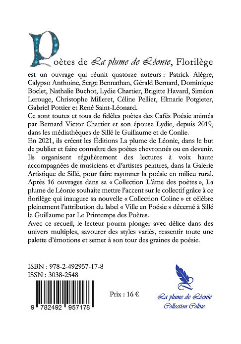 Six ans et demi après le lancement du Café Poésie, La plume de Léonie est fière de présenter dans ce recueil des œuvres de quatorze auteurs, six femmes et huit hommes, tous membres du Café. On y trouve l’expression écrite de la richesse et de la diversité des textes, que ce soit dans le contenu (nature, souvenirs, rêves, imaginaire, voyages intérieurs, rencontres…) ou dans le style (classique en vers, néo-classique en vers libres, prose, conte, nouvelle).
